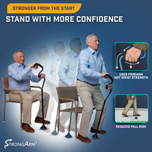 When standing from a seated position StrongArm’s unique design offers that hand up without the need to push off an armrest or the struggle to find your balance as you stand.